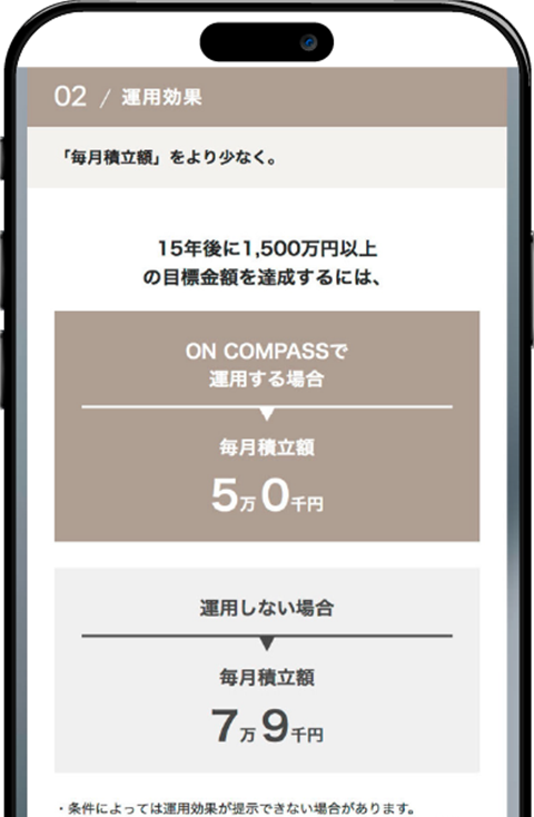 おまかせ運用サービス「ON COMPASS」なら、資産運用プランの作成からゴール達成までをサポートします。質問に答えるだけで最適な資産運用プランをご提案。さらにその資産運用プランにそって、全自動で運用を行います。